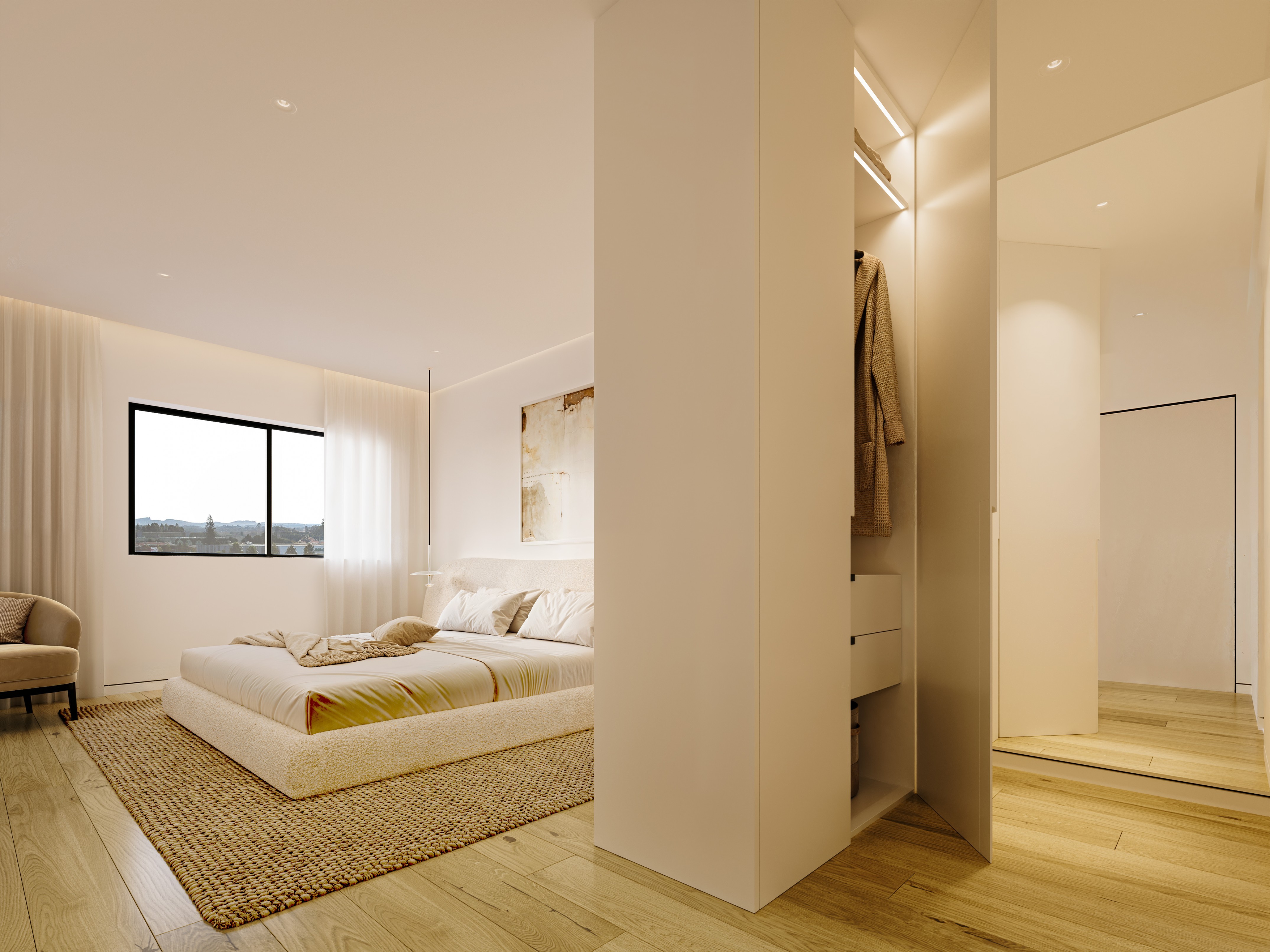 As cozinhas estão totalmente equipadas com eletrodomésticos integrados, e os interiores contam com iluminação LED com sancas de luz, portas de segurança, aspiração central, vídeo porteiro, ar condicionado e aquecimento de águas com bomba de calor, soluções que reforçam a eficiência energética e o conforto térmico. Todos os apartamentos dispõem de lugar de garagem ou box privativa, com tomadas para carregamento de veículos elétricos, garantindo funcionalidade e eficiência energética.