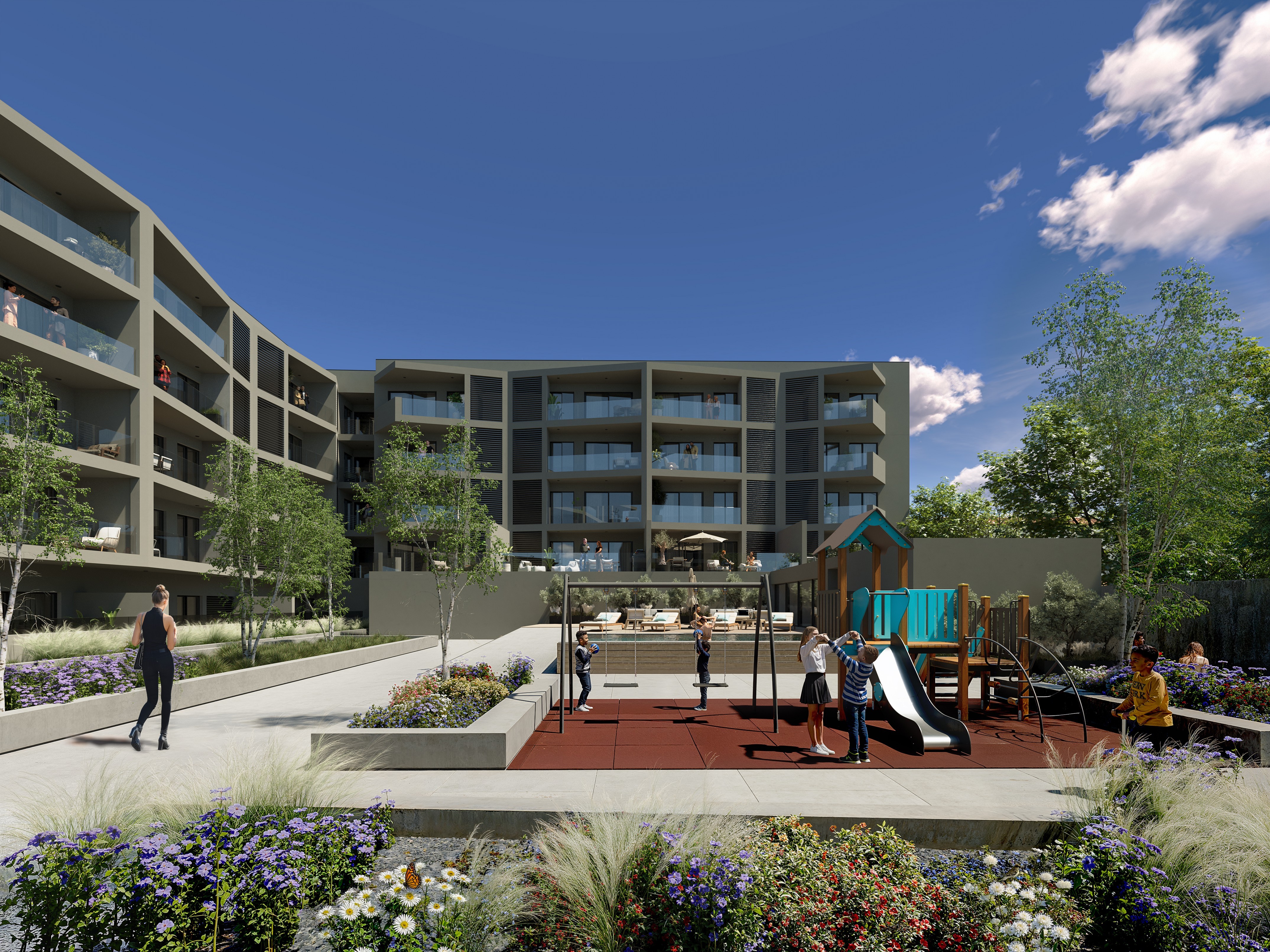 O Evolution Residences oferece ainda um conjunto de áreas comuns pensadas para o lazer e o convívio, incluindo piscina e zonas verdes com jardim, criando um ambiente sereno e equilibrado, ideal para desfrutar de momentos de descanso sem sair de casa.